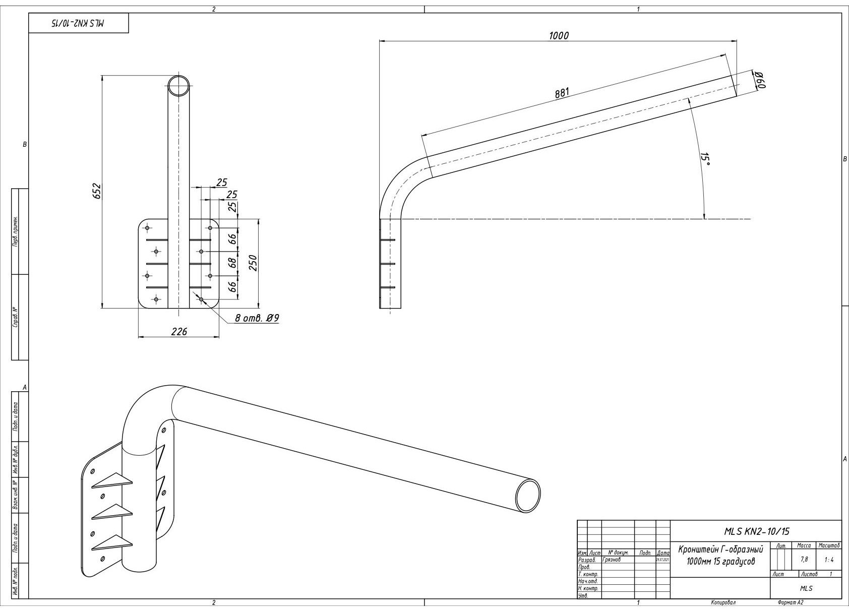 | Чертёж MLS KN2 10/15 Кронштейн Г-образный 1000мм/15 градусов |