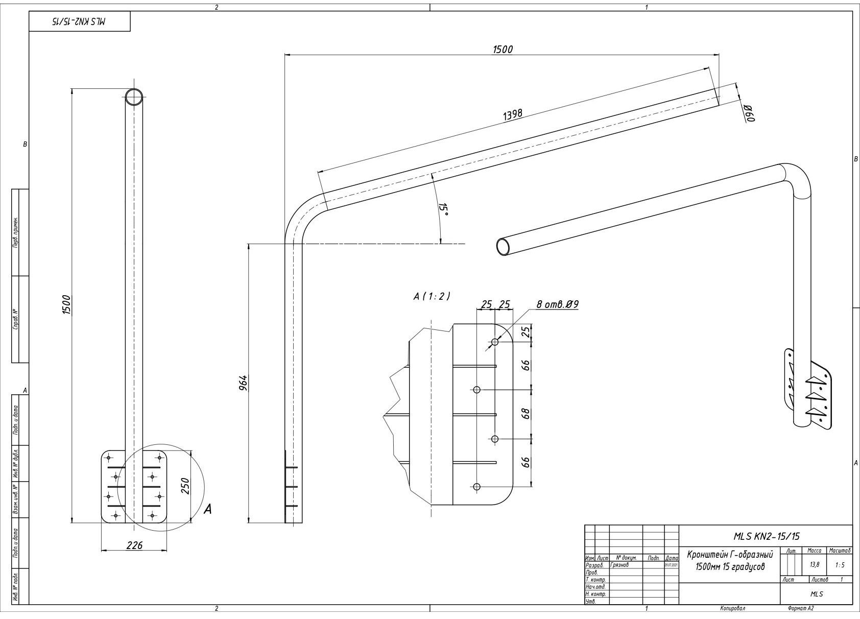 | Чертёж MLS KN2 15/15 Кронштейн Г-образный 1500мм/15 градусов |