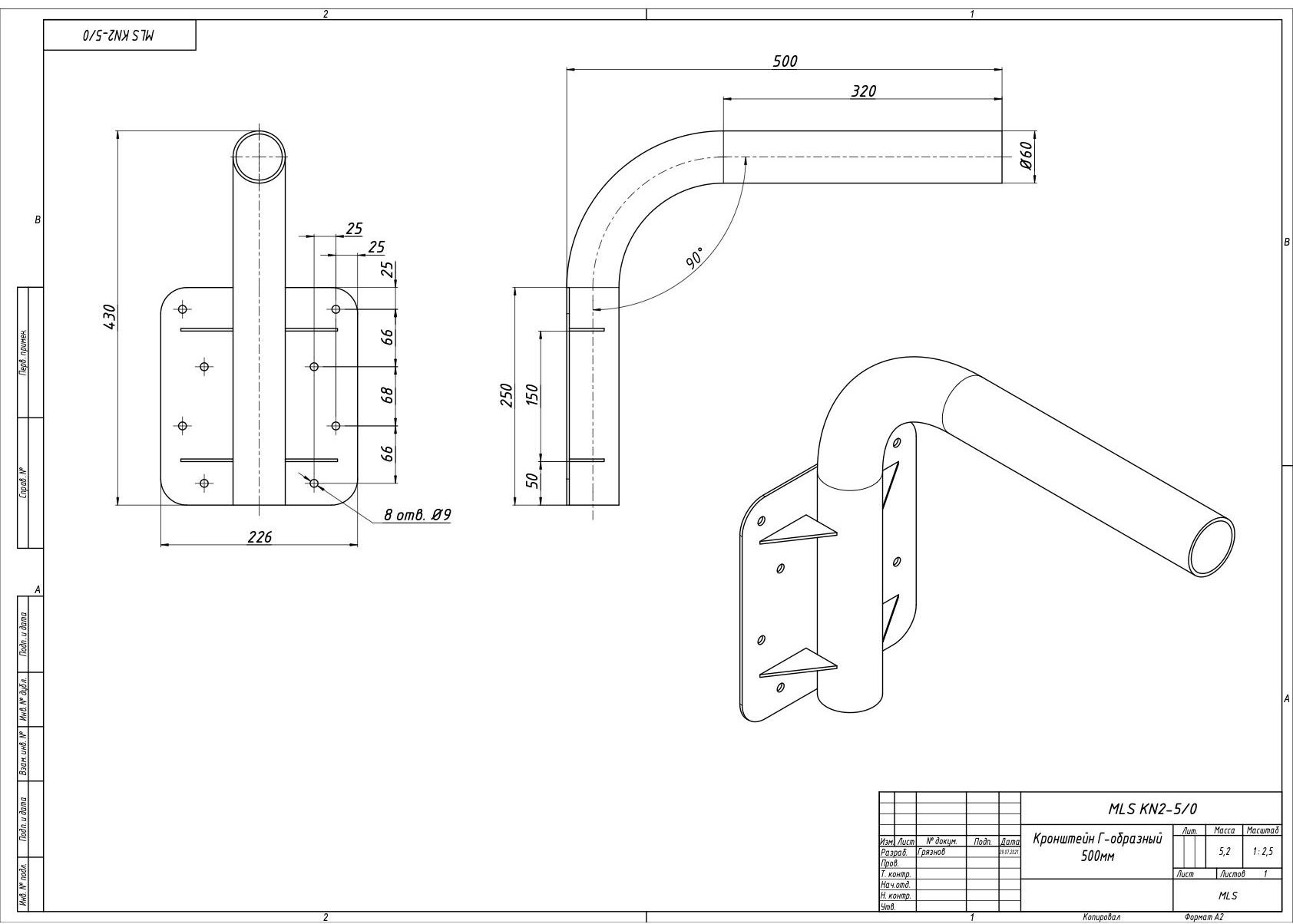 | Чертёж MLS KN2 5/0 Кронштейн Г-образный 500мм |
