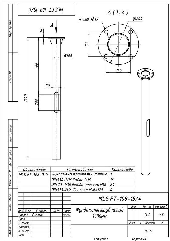 | Чертёж MLS FT-108-15/4 Фундамент трубчатый 1500мм |