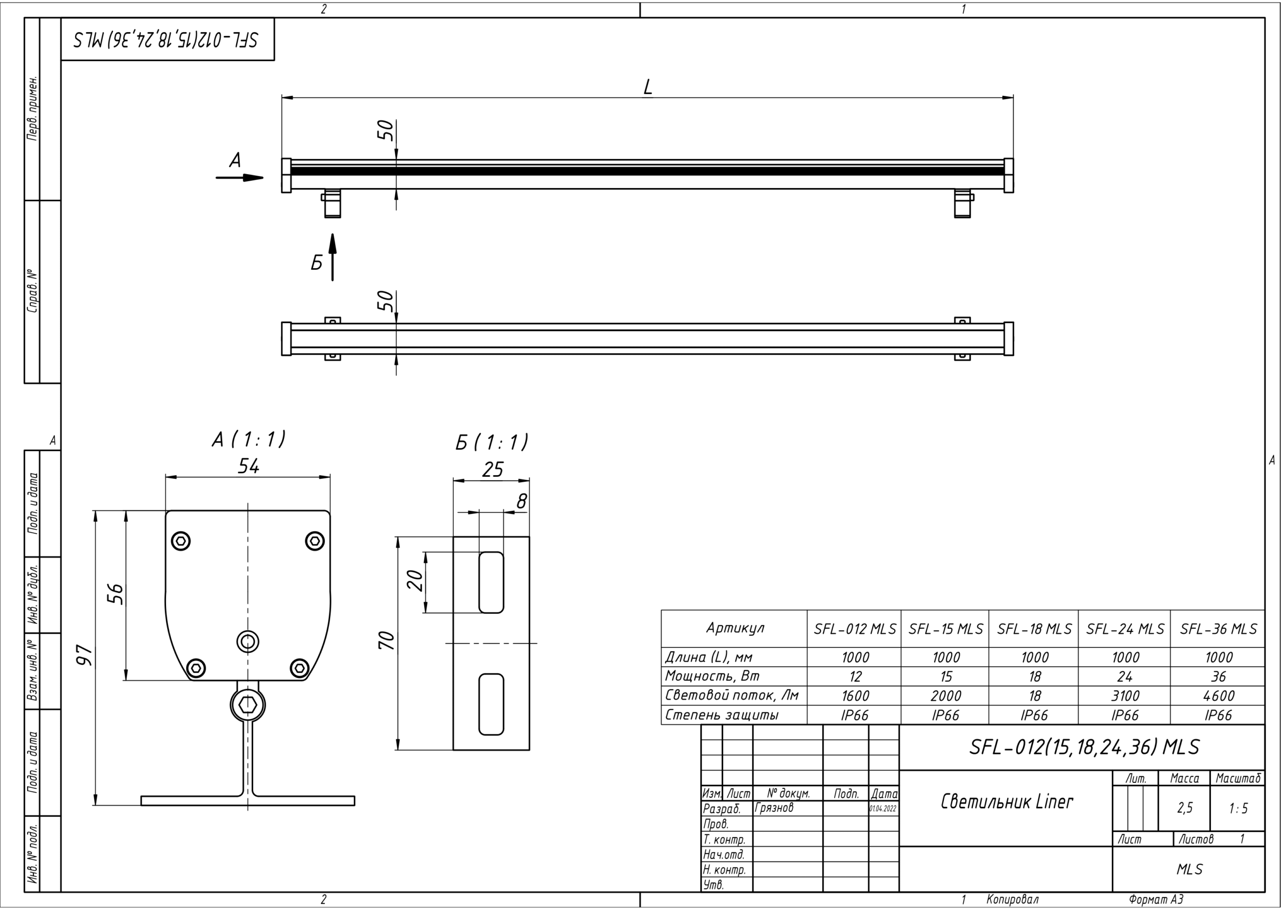 | Чертёж SFL-012(15,18,24,36) MLS Светильник Liner |